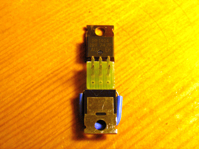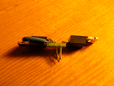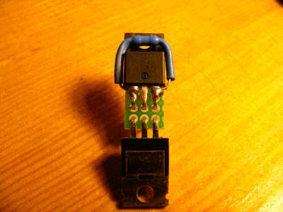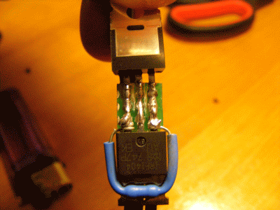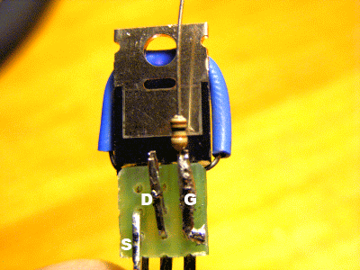 Teraz wyginamy nóżki G i D do góry a nóżkę S w dół. Lutujemy G-G, D-D, S-S razem, a do nóżki G dolutowujemy rezystor 100ohm, jak na poniższym zdjęciu: