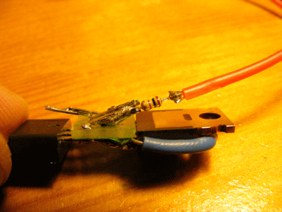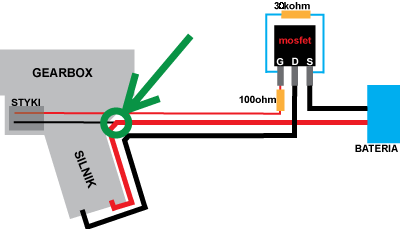 Następnie do rezystora 100ohm dolutować należy kabel sterujący 0,5 mm2, o długości jaka będzie potrzebna, żeby przylutować go do jednego ze styków w Gearbox'ie: