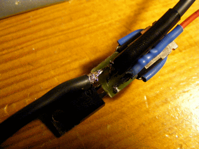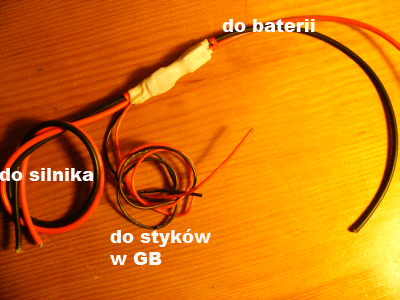 Oczywiście, nieśmiertelna koszylka termokurczliwa pomoże nam zaizolować to połączenie (kabel należy przymocować tak, by szedł w kierunku Gearbox'a - tutaj, w lewą stronę):