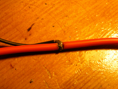 Należy (zostawiając konieczny zapas kabla) rozciąć koszulkę kabla zasilającego, owinąć kablem sterującym i przylutować: